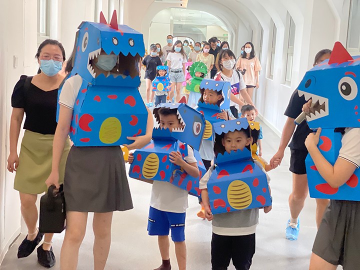 霸王龙、剑龙、三角龙......这些史前巨兽出现在了学园大厅里,原来是老师们精心为小朋友和家长准备的趣味动物DIY活动,小朋友在家长和老师的帮助下拼贴出了各自的小恐龙,有的拼好恐龙纸箱的小朋友已经迫不及待的装扮上,情不自禁地模仿恐龙的动作,把小恐龙表现得活灵活现。